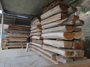 松創様では製材工場を訪問し、木材の製材から乾燥、加工の工程を見学しました。また、国産材から輸入材に至る、樹種も大きさも異なる様々な木材や板材の特性を説明いただき、実際に見たり触れる機会となりました。