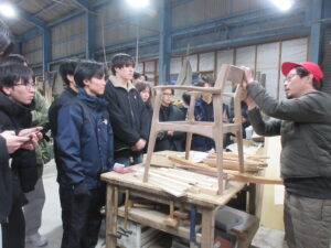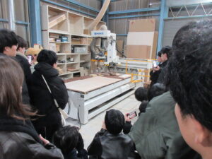 サクラサク様では工場を訪問し、春から大学に導入される家具について、その製造過程を見学しました。また、大型機械を用いた最新の加工技術を見学した一方で、手作業による緻密な木工製作の現場も知る機会となりました。